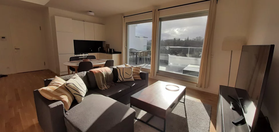 Neugebaute Dachgeschosswohnung im 6. Stock eines klassischen Gebäudes mit exklusiver Nutzung des Aufzugs. Die großzügigen Fenster in der Wohnung ermöglichen einen lichtdurchfluteten Raum und eine erfrischende Luftzirkulation, was eine helle und luftige Atmosphäre schafft.
