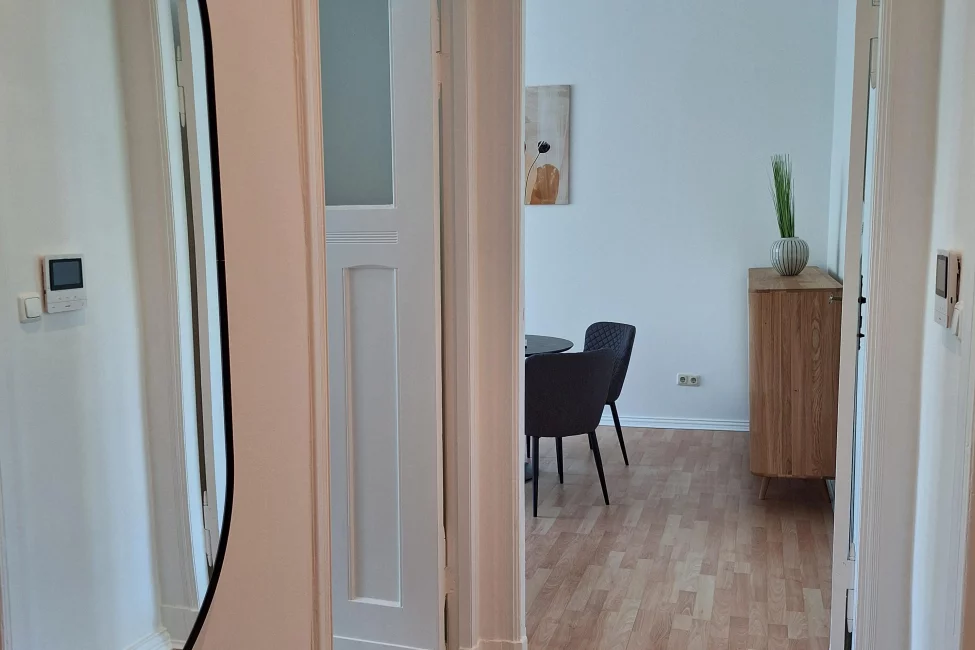 Die Wohnung ist komplett möbliert und voll ausgestattet (Waschmaschine, Bügelaccessoires, Staubsauger, Fön, Handtücher, etc.)