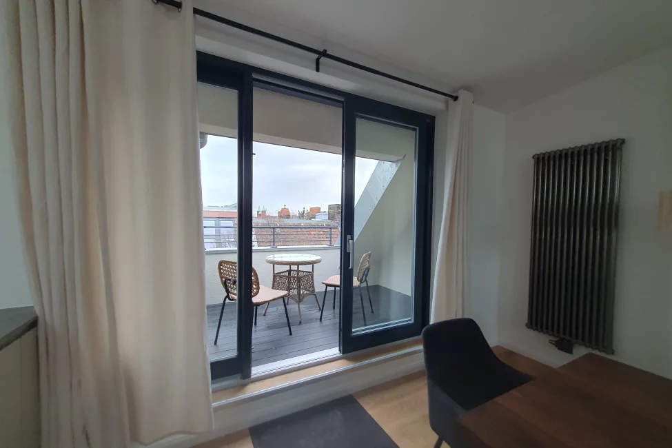 Die neu errichtete Wohnung liegt im Dachgeschoss des Vorderhauses des Hauses, mit Balkon in Ostausrichtung. Der Balkon weist auf den ruhigen Hof.